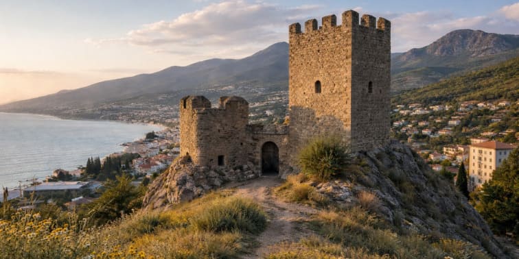Алустон по праву считается символом Алушты. Эта крепость была возведена на месте расположения современного города еще в VI веке по приказу правителя Византии Юстиниана I. Она возвышалась на вершине холма на высоте 44 метра. Расстояние от крепости до моря составляло 200 метров.