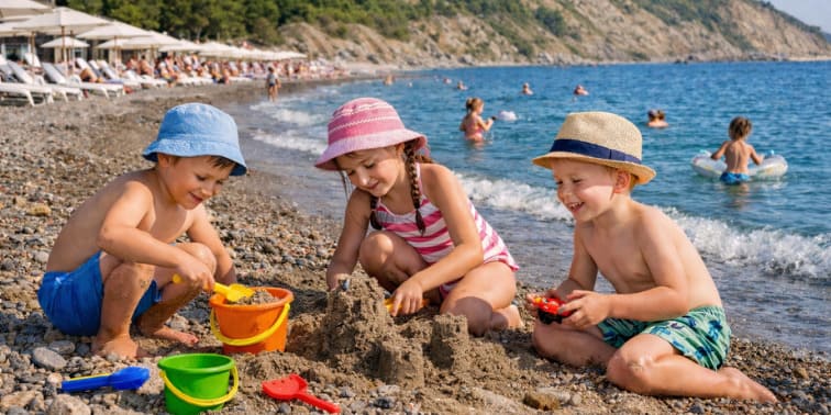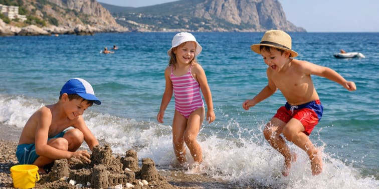 Лучшие пляжи для детей на ЮБК — Массандровский в Ялте, Детский в Алуште, Пляж комплекса Миндальная Роща в Алуште.