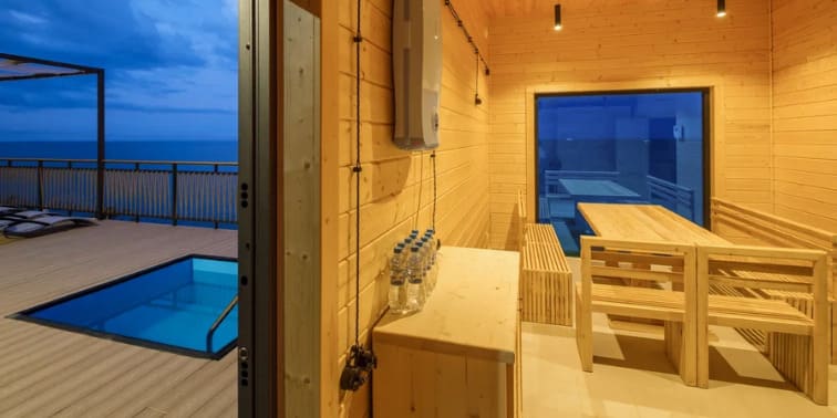 ПосмотретьБанный комплекс эко-отеля «Бунгало Билл» Для гостей эко-отеля «Бунгало Билл» предоставляется бесплатное посещение финской сауны с панорамными окнам